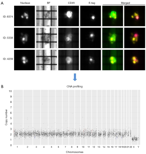 Cells were isolated as single, viable cells, then subjected to whole genome amplification (WGA) to obtain evaluable deoxyribonucleic acid (DNA) using the Ampli1TM WGA kit (Menarini Silicon Biosystems). The quality of each WGA product was checked using the Ampli1 QC kit by amplifying 4 conserved regions of the genome by polymerase chain reaction (PCR). The final product was visualized using Chemidoc XRS; the DNA of each sample was considered suitable for downstream analyses when the number of amplified regions was ≥2.
