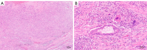 In consideration of the diagnosis, he underwent left upper lobectomy at our center by videothoracoscopic approach (VATS) with a histopathological diagnosis of poorly differentiated NSCLC (G3), pleomorphic. The neoplasm consisted partly of an infiltrating acinar adenocarcinoma with a central portion greater than 10% of the neoplasm, large cells with abundant eosinophilic cytoplasm and pleomorphic nuclei, and with spindle cell foci. The two components expressed cytokeratin 7 and cytokeratin adverse event (AE) 1–3 differently, the amount of adenocarcinoma with intense diffuse positivity, the pleomorphic portion with weak, focal positivity. The neoplastic tumors in both components expressed thyroid transcription factor 1 (TTF1) in a variable manner; negative p40. No evidence of lymphovascular and/or pleural invasion (Figure 1A,1B). Final pathological stage (pTNM): pT1cN0G3LV0R0 (8th edition TNM).