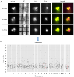 To characterize the elements released into the bloodstream by PC, we searched for CTCs in peripheral blood of patients case 1 and case 2, which was collected prior to surgery. Following recovery, we conducted molecular profiling to assess their CNA profile at whole-genome scale.