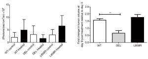 We demonstrate a complete response to SABR in an orthotopic animal model injected with an A549 cell line (15). To assess the response to SABR in isogenic mutant cells, animals were injected subcutaneously in the left flank of YFP/SCID mice and randomly chosen to receive no treatment or a single fraction of 34 Gy. The median survival of mice with EGFR WT-treated and EGFR L858R-treated tumors was 51 and 43 days, respectively (Figure S4). However, nine days post-treatment, a significant decrease in tumor volume was noted in the DEL-treated group compared to WT-treated and L858R-treated groups, while WT and L858R-treated groups both exhibited increased tumor volume post-SABR treatment (Figure 4).