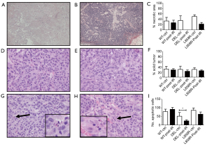 We analyzed tumor samples collected from WT, DEL, and L8585R mice treated with 34 Gy or control 0 Gy for percentage of necrosis, % solid tumor, and the number of apoptotic cells. The % necrosis was similar in control and treated tumors from WT mice (33% vs. 27%). In contrast, we did not observe any necrosis in DEL-treated mice (0% compared to 35% in control DEL mice), and in L858R-treated mice, a difference was observed (22% compared to 50% in L858R-control mice) (Figure 5A-5C). The % solid tumor was similar in control and treated tumours across all mice (32% vs. 28% in WT; 30% vs. 20% in DEL; and 30% vs. 25% in L858R) (Figure 5D-5F). A significant decrease in the average number of apoptotic cells was observed between the treated and control DEL mice (51 vs. 21). In contrast, they were similar between treated and control WT mice (78 vs. 92) and L858R mice (86 vs. 63) (Figure 5G-5I).