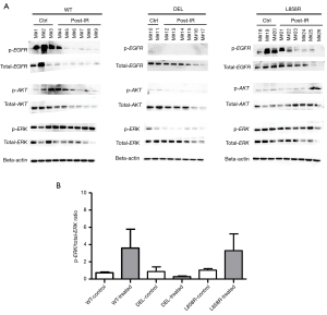 To understand mechanistic differences between the different isogenic tumors in response to SABR, we analyzed tumor tissue using immunoblotting. We assessed the expression of phospho-EGFR (p-EGFR), total-EGFR, phosphor- and total-Ak strain transforming AKT (p-AKT, total-AKT), phosphor- and total extracellular signal-regulated kinase (p-ERK, total-ERK) (Figure 6A), and proteins implicated in cell survival, proliferation, and apoptotic processes. Measured p-ERK levels decreased by a factor of 0.7 in the DEL-treated group and increased by factors of 4.9 and 3.2 in the WT-treated and L858R-treated groups, respectively (Figure 6). These data correlate with reduced cell proliferation and tumor growth observed in the DEL-EGFR-mutant NSCLC post-SABR when compared to WT- and L858R-EGFR-mutant tumors.