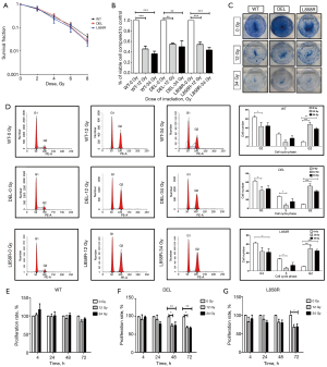 To assess the differential response to radiation in EGFR mutant NSCLCs, A549 cells transfected with lentivirus carrying gene constructs of WT, DEL or L858R were used in clonogenic assays and revealed no significant difference between cell lines (Figure 2A). Cell viability using Vi-Cell (Figure 2B) demonstrated a decrease in the number of viable cells at 12 and 34 Gy by 54% and 63%, respectively, in WT; 45% and 50%, respectively, in DEL; and 46% and 56%, respectively, in L858R. To compare the radioresistance profile of isogenic EGFR-mutant cell lines, we performed the gold-standard clonogenic assay. As shown in Figure 2C, EGFR-mut cell lines showed enhanced radioresistance (SF2 of 0.7 vs. SF of 0.88). An increase in the G2-phase of the cell cycle was also noted in all three cell lines following SABR with 12 and 34 Gy (Figure 2D). Measurements of the proliferation rate post-SABR showed a significant decrease in DEL-EGFR at 48 and 72 h post radiation (P<0.05 and P<0.01, respectively) and of L858R-EGFR at 72 h (P<0.05) (Figure 2E).