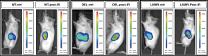 To determine the response of tumors harboring EGFR-WT, EGFR-DEL or EGFR-L858R in vivo, we implanted tumor cells orthotopically in rats and performed image-guided IR (34 Gy). BLI was used to confirm viability of injected cells and tumor size was measured weekly using CT (Figure 3). Tumor measurements showed animals injected with Pre-IR-L858R had the greatest tumor volume, with an average of 7.89 cm3 (range, 0.8–34.1 cm3), compared to Pre-IR-WT and Pre-IR-DEL with an average tumor volume of 0.66 cm3 (range, 0–1.64 cm3) and 0.02 cm3 (range, 0–0.07 cm3), respectively. Animals injected with Pre-IR-DEL showed no tumor development despite BLI confirmation of viability 12 months following injection.