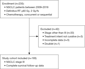 NSCLC patients treated with CRT ≥60 Gy 2009–2018 (n=235) were retrospectively identified from three Mid-East regions in Sweden (Uppsala, Dalarna, and Gävleborg) by using the hospital software for radiotherapy and the International Classification of Diseases, 10th Revision (ICD-10) code for lung cancer (C34). To avoid selection bias, all registered patients were included. After exclusion of subjects with stages other than III [based on the 8th lung cancer tumor, node, metastasis (TNM) classification], non-curative treatment intent and patients with incomplete data, 193 subjects remained (Figure 1).