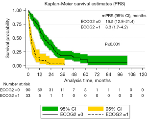 The median follow-up was 52 months with a median OS (mOS) of 33 months (95% CI: 24.5–44.1) and a 1-, 2- and 5-year survival of 79%, 58% and 34% respectively (Figure S1). Patients presenting with an ECOG PS of 2 had a mOS of 24 months compared with 34 months for ECOG PS 0–1 (HR =1.83; 95% CI: 0.98–3.40; P=0.057). Most other pre-treatment variables did not affect OS, including age, sex, smoking status, weight loss prior to diagnosis, stage, histology, the presence of a driver mutation, concurrent vs. sequential chemotherapy, or chemotherapy protocol (weekly vs. every third week, cisplatin vs. carboplatin). Table 2 shows the associations of pre-treatment variables with OS.
