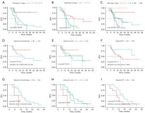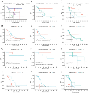 Furthermore, we conducted a stratified assessment of the efficacy of adjuvant therapy in patients with MPR and N-MPR. For patients achieving MPR, no significant trends in EFS extension were observed across groups stratified by adjuvant radiotherapy, adjuvant chemotherapy, or the number of adjuvant cycles (Figure 4G-4I). Given that no mortality events have occurred among patients with MPR, a comparison of OS is not feasible (Figure S2I). For patients who did not achieve MPR, adjuvant radiotherapy showed a trend toward longer EFS (17.50 vs. 9.77 months, P=0.08) and OS (NR vs. 30.63 months, P=0.17), but it was not statistically significant (Figure 4J and Figure S2J). Adjuvant chemotherapy significantly prolonged survival (Figure 4K and Figure S2K), with 4–6 cycles of chemotherapy being particularly effective in extending both EFS and OS (Figure 4L and Figure S2L). Patients who received 7–10 cycles of chemotherapy (neoadjuvant cycle plus adjuvant cycle) had longer EFS and OS compared to those who received fewer cycles (Figure S2M,S2N). Subgroup analyses based on the median time from the end of neoadjuvant chemotherapy to surgery and the median time from surgery to the start of adjuvant therapy shown no significant impact on pathological response (Tables S9,S10).