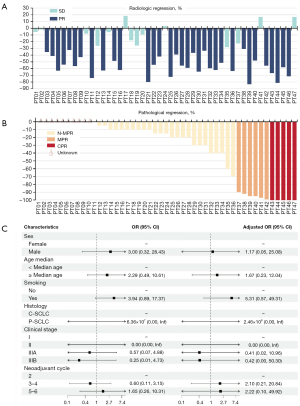 Figure 2A,2B depict tumor regression depths on both radiologic and pathologic levels for each patient. Among the 47 patients, 33 (70.21%) achieved PR and 14 (29.79%) had SD as their best response according to the RECIST criteria (Table S8). In terms of pathologic response, 5 patients (10.64%) achieved CPR, and an additional 6 patients (12.77%, excluding those with CPR) achieved MPR (Table S8). Univariate and multivariable logistic regression analyses revealed no significant differences in pathologic remission across subgroups stratified by sex, age, smoking history, clinical stages, or neoadjuvant cycles; however, a trend toward higher MPR rate in smokers was observed (Figure 2C). No significant positive correlation was found between radiologic and pathologic remission (R=0.171, P=0.31) (Figure S1).