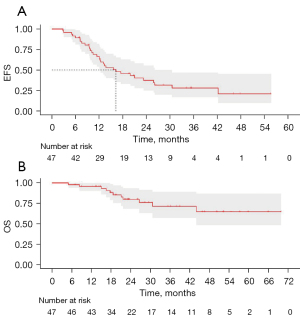 With a median follow-up of 35.367 months [IQR, 26.367 months–not reached (NR)], the median EFS was 16.27 months [95% confidence interval (CI): 12.20–30.53] (Figure 3A). The 1-, 2-, and 3-year EFS rates were 66.64% (95% CI: 54.14–82.02%), 37.44% (95% CI: 25.21–55.60%), and 28.16% (95% CI: 16.85–47.05%), respectively (Figure 3A). As of the data cutoff on October 2, 2024, the median OS had not been reached, with 2-, 3-, and 4-year survival rates of 79.96% (95% CI: 68.36–93.52%), 71.39% (95% CI: 57.12–89.22%), and 64.90% (95% CI: 48.52–86.82%), respectively (Figure 3B).