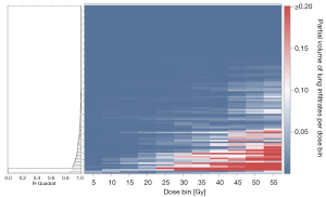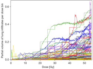 For radiotherapy of lung cancer, there are accepted tolerability limits for lung exposure from the DVHs, such as for the V20 and the mean lung dose (29). However, in the different studies the association with the incidence of grade 2 pneumonitis is only moderate with large scatter in the observed pneumonitis rates per dose bin (30-33). Thus, in large studies, no consistent and clear dependencies were found in the frequency of symptomatic pneumonitis depending on the V20 between 20–35% or mean lung dose between 13.0–19.5 Gy (30,34,35), the range most commonly used in definitive radiochemotherapy of locally advanced lung cancer (36).