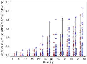 Contoured lung infiltrates outside the PTV were normalized by the total lung volume outside the PTV resulting in the partial volume of lung infiltrates. The partial volume of lung infiltrates per dose step were obtained from the DVHs. DVHs of the lung outside the PTV containing the lung infiltrates and the contoured lung infiltrates outside the PTV were merged in 0.1 Gy dose steps. The infiltrate volume per dose step was normalised by the lung volume per dose step. These data steps were performed in SAS statistical software system (SAS/STAT 15.1, SAS institute Inc., Cary, NC, USA). Each partial infiltrate volume was weighted based on the proportion of lung volume at a specific dose step compared to the total lung volume outside the PTV at that dose. Dose steps (D) of 0.1 Gy were binned to 5 Gy dose bins from x < D < x+5 Gy, for x = 0, 5, 10, (…) 50 Gy as integer multiples of five Gray. A mixed fixed and random effect linear model was used to explain the weighted partial infiltrate volume per dose step data of the patients by the variables dose bin and durvalumab consolidation (yes/no) and a crossed interaction effect between dose bin and durvalumab consolidation as fixed effects. As a random subject effect, the crossed effect between patient and dose bin was introduced, assuming complete independence across subjects. This subject effects models random intercepts for each patient x dose bin combination (Proc Mixed, SAS). This model is termed dose step model. An F-test was used to test whether the random effects have zero variance (20).