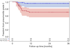 In a further step, we analysed the times to pneumonitis grade 2 in dependence on parameters from the dose response relation for the proportion of infiltrates per dose bin, dosimetric factors of the treatment plans, as V5, V20, and mean lung dose, the mean HU of the pulmonary infiltrates as given in Table 1, and durvalumab consolidation (yes/no), by multivariable proportional hazards analysis. The most likely generalizable Cox model using leave-one-out cross-validation according to the AIC criterion was a one parameter model with the selected variable partial infiltrate volume in dose bin 35–40 Gy in 94% of the leave-one-out cycles as a characteristic of the intermediate dose range sensitivity leading to pulmonary infiltrates. The cross-validated times to pneumonitis grade 2 curves were clearly separated for the high and low risk groups (P<0.001, log rank test) (Figure 4). The hazard ratio was 8.4 (95% CI: 1.9–36.6). The regression coefficient for the partial infiltrate volume in the 35–40 Gy dose bin lung volume from the Cox model was 7.013+1.884 using the whole data set. Therefore, the hazard ratio for pneumonitis grade 2 increases by 7.013% per 1% increase in the partial infiltrate volume in that dose bin.
