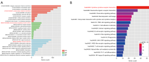 Based on DAVID, 680 DEGs were subjected to GO function enrichment and KEGG signaling pathway analysis. Screening was conducted of 96 biological processes (BP), 11 cellular components (CC), 24 molecular functions (MF), and 17 KEGG signaling pathways (available online: https://cdn.amegroups.cn/static/public/tlcr-24-297-5.xlsx). In the GO function annotation, immune response of BP, external side of plasma membrane of CC, and transmembrane signaling receptor activity of MF had the most significant correlation with TME (Figure 5A). KEGG signaling pathway analysis showed that the most significant correlation was hsa04060: cytokine-cytokine receptor interaction (Figure 5B, Figure S1).