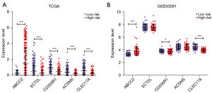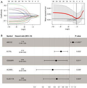 A total of 160 DEGs with significant survival prognosis were screened from 680 TME-DEGs by the univariate Cox regression analysis (available online: https://cdn.amegroups.cn/static/public/tlcr-24-297-6.xlsx). Multivariate Cox regression analysis was then performed on the 160 DEGs, and 26 DEGs independently and significantly correlated with prognosis were screened (available online: https://cdn.amegroups.cn/static/public/tlcr-24-297-7.xlsx). Finally, LASSO survival regression analysis was performed on the 26 DEGs, and 5 ITME genes were obtained (Figure 6A), all independently and significantly correlated with prognosis (Figure 6B). These 5 DEGs were ABCC2, ECT2L, CD200R1, ACSM5, and CLEC17A, important TME-DEGs associated with prognosis.
