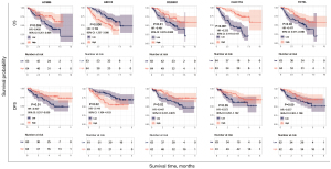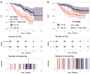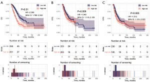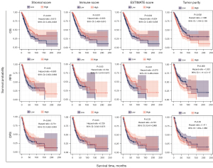 To compare the differences in survival with different ESTIMATE model scores levels, the samples were divided into low- and high-level groups respectively according to the median level of the 4 scores, and the differences in overall survival (OS), relapse-free survival (RFS), and disease-free survival (DFS) were analyzed. The results showed that the OS, RFS, and DFS of the groups with high scores were all significantly better than those of the low-scoring groups (Figure 3), indicating a good prognosis for high scores patients (the corresponding clinical prognostic information and other data of the samples are shown in https://cdn.amegroups.cn/static/public/tlcr-24-297-2.xlsx).