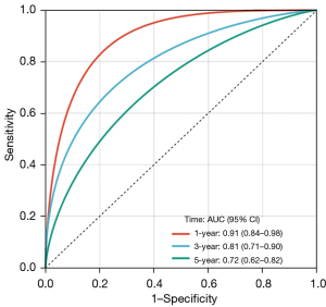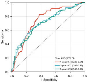 The RS values of the samples were calculated from the TCGA training dataset and divided into high and low groups based on the median value. The results of prognostic correlation analysis showed that the OS (P<0.001), RFS (P=0.009), and DFS (P=0.005) of patients in the low RS group were significantly better than those in the high RS group (Figure 10, available online: https://cdn.amegroups.cn/static/public/tlcr-24-297-11.xlsx). The ROC curve was used to analyze the accuracy of the prediction model, and the results showed that it had good prediction efficiency for 5-year OS (AUC =0.70), RFS (AUC =0.59), and DFS (AUC =0.56) (Figure 11, Figure S2).