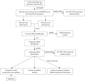 The transcriptomic data [Estimation of STromal and Immune cells in MAlignant Tumor tissues using Expression data (ESTIMATE) algorithm] was employed to assess the immune status of LUAD patients and estimate the stromal cells and immune cells in tumors. An ESTIMATE model score was subsequently assigned, comprising an Estimate score, immune score, stromal score, and tumor purity rating. It was used to assess the degree of immune cell invasion and the immune status (18). According to the median value of the above 4 scoring dimensions, the patients were divided into two groups, and the differences in survival prognosis among sample groups with different scoring levels were explored. Further, the patients were divided into high versus low stromal score and high versus low immune score groups according to the immune score and stromal score results, respectively. Limma algorithm was used to identify the significant DEGs between the two groups. The genes with false discovery rate (FDR) <0.05 and |log2 fold change (FC)| >0.5 were considered TME-related DEGs (TME-DEGs). Moreover, hierarchical clustering was performed on the selected DEGs, and the results were analyzed by Database for Annotation, Visualization and Integrated Discovery (DAVID; version 6.8; https://david.ncifcrf.gov/) under the 2-grade intersection of DEGs of biological annotations [including Gene Ontology (GO) function and Kyoto Encyclopedia of Genes and Genomes (KEGG) enrichment] signaling pathway (19,20).