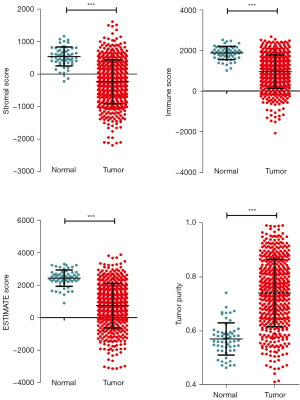 Five hundred and fifty-nine samples were collected from the TCGA training data set, including 58 control samples of normal individuals and 501 LUAD tumor samples of LUAD patients. The genes’ expression levels were used to calculate each patient’s Estimate score, immune score, stromal score, and tumor purity, and the differences between LUAD samples and control samples were compared (available online: https://cdn.amegroups.cn/static/public/tlcr-24-297-1.xlsx). The results showed that the Estimate score, immune score, and stromal score in LUAD tumor samples were significantly lower than those in control samples, and tumor purity was significantly higher than in control samples (Figure 2).