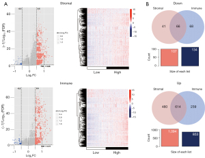 According to the results of the immune score and stromal score, the samples were divided into two groups (high and low stromal score group, high and low immune score group); 1,201 and 987 DEGs conformed to the threshold conditions respectively, and their expression levels were analyzed (Figure 4A, available online: https://cdn.amegroups.cn/static/public/tlcr-24-297-3.xlsx). Moreover, the DEGs sets filtered from stromal and immune score were compared and filtered further to obtain their intersections set. 66 DEGs with significantly down-regulated expression and 614 with significantly up-regulated expression were obtained (Figure 4B, available online: https://cdn.amegroups.cn/static/public/tlcr-24-297-4.xlsx).