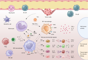 IL, interleukin; NO, nitric oxide; PD-1, programmed death-1; PD-L1, programmed death-ligand 1; TAM, tumor-associated macrophage; TME, tumor microenvironment; TNF-α, tumor necrosis factor-alpha.