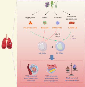 TCM exerts anti-tumor effects through immunomodulation of TME components. Specifically, TCM enhances the expression and functional activity of CD4+ T cells, CD8+ T cells, natural killer (NK) cells, and DCs, while suppressing M2 polarization of TAMs and the immunosuppressive function of Tregs, thereby remodeling the immunosuppressive TME. This process inhibits immune escape of lung cancer cells and ultimately blocks tumor invasion and metastasis (60,61). Furthermore, the functional polarization of TAMs is precisely regulated by multiple cytokines and signaling proteins within the TME. TCM modulates TAM polarization and functional characteristics by differentially regulating the expression of these key molecular mediators, ultimately suppressing lung cancer metastasis. Li et al. revealed that ginsenosides exert anti-tumor effects by regulating TAM differentiation states and their interactions with the TME, with their anti-tumor mechanisms primarily depending on indirect modulation of the immune microenvironment (62). Polyphyllin VII promotes M1 macrophage polarization and inhibits STAT3 phosphorylation through activation of the STING/TBK1/IRF3 signaling pathway, a mechanism that is strongly associated with STING protein expression levels (63) (Figure 2).