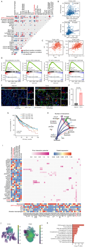 TME plays a pivotal role in tumor progression. To further investigate the intercellular interactions of SPP1+ macrophages with other TME cells, we conducted a comprehensive deconvolution analysis of RNA sequencing data from seven independent NSCLC cohorts. Notably, FAP+ fibroblasts and SPP1+ macrophages exhibited the most significant correlation among myeloid and stromal cells across 7 NSCLC cohorts, suggesting a potential functional interplay that may contribute to tumor progression (Figure 4A). Further analyses confirmed that both the infiltration of FAP+ fibroblasts and SPP1+ macrophages and expression of FAP and SPP1 exhibit significant positive correlations (Figure 4B,4C, Figure S4A,S4B). To uncover possible molecular processes involving these two cell types, we performed gene set enrichment analysis (GSEA) between samples with the high and low infiltration of FAP+ fibroblasts and SPP1+ macrophages in TCGA-LUAD. TNF-α signaling via NF-κB and IL-6-JAK-STAT3 signaling was involved in FAP+ fibroblasts-high SPP1+ macrophages-high, which could benefit for immune evasion and drug resistance (79). Furthermore, elevated genes were also highly enriched in TGF-β signaling and inflammatory response (Figure 4D). Meanwhile, we utilized multiplex immunofluorescence staining in NSCLC patients adjacent and tumor tissues, which confirmed more colocalization of FAP+ fibroblasts and SPP1+ macrophages in tumors, indicating a potential functional crosstalk between these two cells (Figure 4E,4F, Table S2). We also assessed the interactions between SPP1− macrophages and FAP+ fibroblasts. The results demonstrate that tumor tissues contain a significantly higher number of SPP1− macrophages interacting with FAP+ fibroblasts compared to adjacent tissues, exceeding the interactions observed between SPP1+ macrophages and FAP+ fibroblasts. Based on previous studies, these SPP1− macrophages may represent M1, M2, or other types of tumor-associated macrophages (80-82), each potentially serving distinct functions. This finding highlights the existence of multiple cell interactions within TME, which can either promote or inhibit tumor progression. The diversity of these interactions contributes to the formation of a unique immune microenvironment that influences tumor behavior (Figure S4C, Table S3). In addition to elevated expression and infiltration in tumor tissues, we also observed the patients with high FAP+ fibroblasts and high SPP1+ macrophages infiltration had a worse OS (log-rank P=0.04) (Figure 4G). To elucidate the communication networks underlying this co-infiltration, we constructed a cell-cell interaction map, where nodes represent cell types and edges indicate interaction frequency. Notably, stromal cells and myeloid cells exhibited the strongest communication compared to other cell types in TME (Figure S4D). Moreover, FAP+ fibroblasts and SPP1+ macrophages exhibited strong intercellular communication (Figure 4H). NicheNet analysis further revealed key ligand-receptor interactions, highlighting adhesion-related signaling pairs such as VCAN-ITGB1, which may facilitate their functional crosstalk within TME (Figure 4I,4J). GSEA enrichment analysis of ligand activity gene sets associated with ECM receptor interaction, focal adhesion, and PI3K-AKT signaling further confirmed the critical role of these pathways in mediating the interplay between FAP+ fibroblasts and SPP1+ macrophage (Figure 4K). Collectively, these findings underscore the significance of the FAP+ fibroblasts-SPP1+ macrophage axis in NSCLC pathogenesis, unveiling potential therapeutic targets within this interaction network.