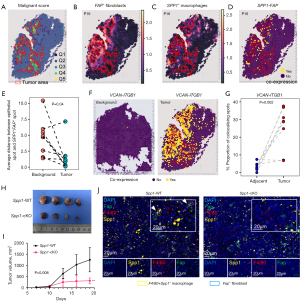 To elucidate the spatial relationships between FAP+ fibroblasts and SPP1+ macrophages, we performed ST analysis on tumor tissue sections from NSCLC patients. A panel of 41 tumor-specific genes, based on high expression in epithelial cells within tumor samples (Figure 1F, Table S1), was leveraged to calculate the malignancy score, which was then employed to delineate the tumor regions with high transcriptional activity (Figure 5A, Figure S5A,S5B). We utilized Cell2location to infer cell-type abundance by leveraging cell-type expression profiles derived from scRNA-seq. The results revealed an intriguing spatial organization within TME, characterized by tumor cells enveloped by FAP+ fibroblasts and SPP1+macrophages. This arrangement suggests a microenvironment that facilitate tumor progression and immune modulation (Figure 5B-5D, Figure S5B-S5D). We measured the average distance between epithelial spot and FAP-SPP1 spot and found that FAP-SPP1 colocalization was closer to epithelial spot in tumor tissues. Moreover, a significant positive correlation was observed between the signatures of FAP+ fibroblasts and SPP1+ macrophages, underscoring their interconnected roles in this spatially organized microenvironment (Figure 5E, Figure S5E,S5F). To further investigate the interactions within this microenvironment, we considered ligand-receptor colocalization, defined as the expression of both genes within a single spot. Notably, we identified co-localizations of VCAN and ITGB1 in tumor regions, which were enriched in tumor-derived tissue compared to the background and surrounding tumor areas (Figure 5F,5G). This finding underscores the complex interplay of cellular components in TME and their potential implications for tumor biology. To examine the role of SPP1+ macrophages in this process, we created Lyz2CreSpp1fl/fl conditional genetically ablated mice. Subsequently, subcutaneous implantation of LLC lung adenocarcinoma cell lines in both wild-type and Spp1-deficient mice demonstrated significantly smaller tumors in the Spp1-deficient group (P=0.008, n=4) (Figure 5H,5I). Immunofluorescence staining of the tumors revealed a notable colocalization of SPP1+ macrophages and FAP+ fibroblasts in wild-type (Spp1-WT) mice, a relationship that was absent in the Spp1-deficient (Spp1-cKO) mice (Figure 5J). The results indicate that spatial interactions between SPP1+ macrophages and FAP+ fibroblasts in tumor tissues promote NSCLC progression, and intervening with SPP1+ macrophages can inhibit tumor growth in mice.