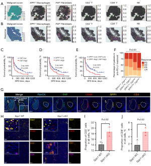 Tumors can be broadly classified based on their immune infiltration status as immune-excluded, inflamed (“hot”), or immune-desert (“cold”) (83), depending on the presence and activity of immune cells, particularly CD8+ T cells (84). The level of immune infiltration within the tumor influences the patient’s response to immunotherapy. Guided by these distinctions, we analyzed the spatial transcriptome data of tumor tissues from patients who did or did not respond to immunotherapy (25). The results revealed that in non-responding tumor samples, SPP1+ macrophages and FAP+ fibroblasts showed significant infiltration in tumor edge area, with extremely few CD4+, CD8+ T and NK cells localized at the tumor periphery (Figure 6A). Conversely, in the tumor samples from responders, the infiltration of SPP1+ macrophages and FAP+ fibroblasts was reduced, while a substantial number of CD4+, CD8+ T and NK cells were infiltrating in the tumor area (Figure 6B). To investigate the clinical implications of this immune-excluded microenvironment, we analyzed survival data from NSCLC patients receiving anti-PD-L1 therapy (33). Elevated expression of FAP+ fibroblasts/SPP1+ macrophages was associated with significantly lower disease-free survival (DFS) (Figure 6C,6D), and patients with elevated levels of both cell populations experienced a significantly greater decline in survival compared to those with lower levels of these populations (Figure 6E). Consistently, elevated expression of FAP and SPP1 was associated with a significantly lower proportion of complete or partial responders and a higher incidence of progressive or stable disease, underscoring their association with poor therapeutic outcomes (Figure 6F). These findings suggest that the FAP+ fibroblast-SPP1+ macrophage axis may contribute to resistance against immune checkpoint blockade, highlighting a potential barrier to effective anti-tumor immunity. To reinforce these observations, multiplex fluorescent staining of human NSCLC samples demonstrated that FAP+ fibroblasts and SPP1+ macrophages often co-localize and assemble a pro-fibrotic shield that excludes immune cells from the tumor interior (Figure 6G). Matching evidence emerged from Lyz2CreSpp1fl/fl conditional genetically ablated mice, where tumors derived from subcutaneous injection of LLC cell lines displayed increased infiltration by CD3+ and CD8+ T cells in TME (Figure 6H-6J, Table S4). These findings highlight the collaborative role of FAP+ fibroblasts and SPP1+ macrophages in driving immunosuppression and fostering resistance to immune-based therapies.