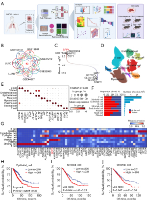To identify genes associated with tumor progression in NSCLC, we conducted a differential expression analysis of genes between adjacent and tumor samples across 7 independent cohorts (Figure 1A, table available at https://cdn.amegroups.cn/static/public/tlcr-2025-244-1.xlsx). This analysis revealed a total of 82 DEGs that were either upregulated or downregulated in tumor samples (Figure 1B). Among these DEGs, SPP1, TMPRSS4, MMP12, COL1A1, and CST1 emerged as the most significantly upregulated genes (Figure 1C). Notably, SPP1 and CST1 have been implicated in the regulation of the immune microenvironment in NSCLC (56,57), suggesting their potential role in modulating immune responses within the tumor context (25,30). In contrast, TMPRSS4 and MMP12 are known to facilitate the invasion and metastasis of NSCLC, highlighting their contributions to tumor aggressiveness (58-60). In order to illustrate which cells contributed to these DEGs, we integrated 13 scRNA-seq datasets. After rigorous quality control and correction for batch effects, a total of 547,360 high-quality cells were retained for subsequent analyses (Figure 1D, Figure S1A,S1B). Unsupervised clustering of these cells identified 9 major cell populations according to marker genes (61): T cells (CD3E and CD3D), epithelial cells (EPCAM and KRT19), B cells (CD79A and MS4A1), stromal cells (COL1A1 and COL3A1), myeloid cells (LYZ and FCGR3A), endothelial cells (VWF and PLVAP), mast cells (TPSB2 and KIT), ciliated cells (DYNC2H1 and FOXJ1) and plasma cells (JCHAIN and MZB1) (Figure 1E). Notably, tumors and adjacent samples differed in the relative proportions of cell types (e.g., epithelial cells, stromal cells, etc.), underscoring the potential functional heterogeneity underlying NSCLC progression (Figure 1F). To gain deeper insights into the role of these DEGs in NSCLC progression, we analyzed their expression across different cell types in scRNA-seq data. Interestingly, beyond the genes specifically upregulated in epithelial cells, we also observed a subset that exhibits high expression in the stromal and myeloid cells, suggesting a broader role in the TME of NSCLC (Figure 1G). Notably, SULF1 and COL1A1 were largely enriched in stromal cells, and SPP1 was mainly contributed by myeloid cells (Figure S1C-S1H). To capture the distinct molecular profiles associated with each cell type, we constructed cell type-specific gene signatures based on the DEGs identified. For stromal cells, myeloid cells, and epithelial cells, specifically elevated genes were enrolled to construct cell type-specific signatures (Figure 1G, Table S1). We then assessed the clinical relevance of these signatures by analyzing overall survival (OS) in NSCLC patients from the TCGA cohort. Notably, patients whose tumors displayed elevated epithelial gene expression exhibited significantly worse OS (log-rank test, P<0.001, cutoff =0.35). Similarly, higher expression of myeloid and stromal-specific genes was associated with poorer OS (log-rank test, P=0.044 and 0.047, cutoff =0.29 and 0.36) (Figure 1H-1J). These findings underscore the importance of cell type-specific transcriptional programs in shaping NSCLC progression and patient outcomes.