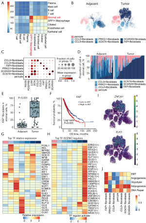 To investigate the impact of SPP1+ macrophages on NSCLC progression, we analyzed their interactions with other cell types. Our results revealed that SPP1+ macrophages exhibited the strongest interactions with stromal cells (Figure 3A). In NSCLC, an expanding body of evidence had proved that fibroblasts were pivotal stromal cell populations involved in tumor initiation, progression, and therapeutic response (72-74). To identify the specific stromal cell populations that interact with SPP1+ macrophages, we clustered these stromal cells into 7 subpopulations (Figure 3B,3C). Pericytes were clustered based on the high expression of RGS5 and PDGFRB (75). Fibroblasts were charactered by DCN and LUM and further classified into 6 subtypes (16), including CCL2+/CCL5+ fibroblasts (chemokine-mediated immune cell recruitment), FAP+ (fibroblast activation protein) fibroblast, SCN7A+ fibroblast, scavenger receptor class a member 5 (SCARA5+) fibroblast and PRKG1+ fibroblast (Figure 3C). Notably, the proportion of FAP+ fibroblasts was significantly enriched in tumor-derived samples, whereas SCN7A+, CCL2+ and SCARA5+ fibroblasts predominated in adjacent samples (Figure 3D,3E, Figure S3A-S3C). Meanwhile, we observed that elevated levels of FAP+ fibroblasts were significantly associated with poorer OS in NSCLC patients (Figure 3F, Figure S3D,S3E), which aligns with the previously reported role of FAP+ fibroblasts in NSCLC (76). These results suggest distinct functional roles of fibroblast subtypes in shaping disease progression. To uncover key transcriptional regulators in FAP+ fibroblasts, we performed pySCENIC analysis, which identified ZNF281, a regulator of fibroblast activation and myofibroblast differentiation through extracellular matrix (ECM) remodeling (77). Additionally, ELK3, known to negatively regulate Serpine1 in mouse embryonic fibroblasts and NIH/3T3 cells, emerged as a potential modulator (78) (Figure 3G-3I, Figure S3F). These regulatory factors may serve as critical drivers of the tumor-specific phenotype of FAP+ fibroblasts, shaping their functional role within TME. Moreover, we applied Decoupler to assess pathway activity across fibroblast subpopulations, revealing distinct functional profiles. FAP+ fibroblasts exhibited strong enrichment in epithelial-mesenchymal transition (EMT), angiogenesis, glycolysis, and DNA repair, suggesting a tumor-supportive role. In contrast, SCN7A+ and SCARA5+ fibroblasts showed higher activation of adipogenesis, indicating potential functional divergence within the stromal compartment (Figure 3J). To gain a deeper understanding of the function characteristics of these fibroblast subsets, we categorized them according to the established CAF classification (16). The results indicated that FAP+ and PRKG1+ fibroblasts exhibited characteristics of myofibroblastic CAF (myoCAF), SCN7A+ and SCARA5+ fibroblasts displayed characteristics of endothelial-to-mesenchymal transition CAF (endCAF), while CCL2+ fibroblasts were more akin to inflammatory CAF (iCAF). Additionally, CCL5+ fibroblasts showed features characteristic of both adipogenic CAF (adjCAF) and antigen-presenting CAF (apCAF) (Figure S3G).