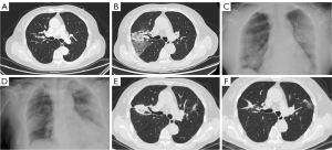 Pleural pain and pneumothorax were the most comment treatment-related complications that frequently occurred together. The patient in Figure 1 developed right-sided pleuritic pain. A chest X-ray at 3 days revealed a right-sided pneumothorax. The condition was managed conservatively with supplemental oxygen and antibiotics. The patient’s hospitalization was prolonged due to pneumothorax exacerbation, requiring thoracic closed drainage. A CT at 4 days revealed the disappearance of the right pneumothorax. Subsequent CT at 1 and 12 months revealed that the pulmonary solid shadow gradually became smaller. Additional representative cases (Figure S2) showed delayed pleural effusion and cavitation, both recovered after symptomatic treatment.