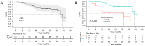 The median follow-up was 24 months (range, 3–44 months). The median LPFS was 41.0 months, and 1-, 2-, and 3-year LPFS rates were 87.5%, 73.4%, and 69.8%, respectively (Figure 3A). The median PFS was 37.0 months, and 1-, 2-, and 3-year PFS rates were 79.0%, 59.6%, and 52.1%, respectively (Figure S3A). The analysis of prognostic factors revealed that CBCT-guided transbronchial RFA exhibited better outcomes compared to X-ray guidance, significantly affecting LPFS (1- and 3-year LPFS rates: 97.2% vs. 55.4%, 79.3% vs. 36.9%, P<0.001) and PFS (1- and 3-year PFS rates: 86.2% vs. 55.4%, 67.9% vs. 11.1%, P<0.001) (Figure 3B, Figure S3B).