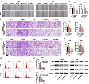 To investigate the potential effects of PPM1G on LUAD cell metastasis and growth, we also assessed the function of PPM1G in LUAD cell metastasis and cell cycle. Wound healing assay revealed that PPM1G overexpression accelerated H1299 and A549 cell migration, while knockdown of PPM1G suppressed cell migration (Figure 3A,3B). Transwell assay also demonstrated that PPM1G accelerated LUAD cell migration and invasion (Figure 3C-3F). We also found that knockdown of PPM1G caused cell cycle arrest at the G1 phase (Figure 3G,3H). Cell cycle-related proteins, CDK4, CCNE1, and CCND1, are involved in cell’s passage from the G1 to the S-phase of the cell cycle (18-20). Here, we found that the levels of CDK4, CCNE1, and CCND1 were decreased via knockdown of PPM1G (Figure 3I; Figure S2B).