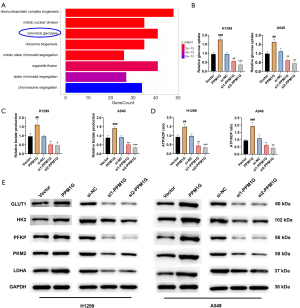 We additionally sought to characterize the biological processes correlated with PPM1G. We conducted GO analysis and found that PPM1G was correlated with canonical glycolysis (Figure 4A). Knockdown of PPM1G impeded the glucose uptake, suppressed the accumulation of lactate, and decreased the ATP/ADP ratio in LUAD cells (Figure 4B-4D), while PPM1G overexpression had the opposite effect. In addition, the levels of glycolysis regulatory proteins, GLUT1, HK2, PFKP, PKM2, and LDHA, were decreased by the knockdown of PPM1G and upregulated by the overexpression of PPM1G (Figure 4E; Figure S2C). These results suggest that PPM1G can accelerate glycolysis in LUAD cells.