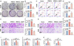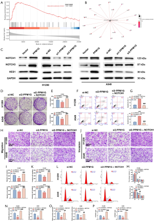 We conducted GSEA to identify the signaling pathways that were regulated by PPM1G (Figure S2D). We found that PPM1G overexpression was positively correlated with the expression of the regulatory genes of the NOTCH signaling pathway (Figure 5A,5B). Western blotting revealed that PPM1G overexpression promoted NOTCH1, NOTCH3, and HES1 protein expression, while knockdown of PPM1G had an opposite effect (Figure 5C; Figure S2E). To determine whether PPM1G promotes LUAD progression via NOTCH signaling, si2-PPM1G and pc-DNA3.1 NOTCH1 was cotransfected into LUAD cells (Figure S3A). We found that NOTCH1 overexpression reversed the suppression of cell proliferation, migration, invasion, cell cycle, and glycolysis and the promotion of cell apoptosis caused by PPM1G knockdown (Figure 5D-5P). Conversely, treatment with the DAPT reversed the promotion of cell proliferation, migration, invasion, and glycolysis and the suppression of cell apoptosis induced by PPM1G overexpression (Figure 6A-6K). These findings suggest that the NOTCH signaling pathway plays an important role in PPM1G -mediated cancer cell proliferation, invasion, and glycolysis.