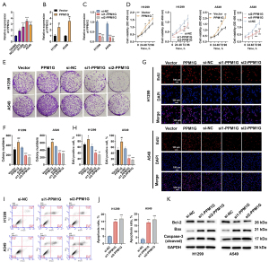 To further determine the role of PPM1G in LUAD development, we induced ectopic expression and knockdown of PPM1G in LUAD cells and evaluated cell proliferation and apoptosis. We first observed the basic level of PPM1G in several LUAD cell lines and found notably elevated expression in all LUAD cell lines as compared with the normal cell line 16HBE (Figure 2A and Figure S1C). Among these LUAD cell lines, PPM1G expression in H1299 and A549 cells was between H23 and NCI-H1975 cells. H1299 and A549 cells with medium expression of PPM1G are more likely to reflect the biological characteristics of most lung cancer cells and enhance the transformability of the results. Therefore, we selected H1299 and A549 cells for subsequent experiments. As shown in Figure 2B,2C and Figure S1D, the expression of PPM1G was notably elevated or suppressed by transfection with PPM1G-overexpressing vectors or siRNAs (si1-PPM1G and si2-PPM1G). Next, the potential effects of PPM1G on LUAD cell viability, proliferation, and apoptosis were investigated. Cell viability and proliferation were elevated in the PPM1G-overexpression group and suppressed in the si-PPM1G group (Figure 2D-2H). Moreover, cell apoptosis was elevated by knockdown of PPM1G (Figure 2I,2J), and there was a decrease in the expression of antiapoptotic protein Bcl-2 and an increase in that of proapoptotic proteins Bax and cleaved caspase-3 (Figure 2K; Figure S2A). These data indicate the pro-proliferative role of PPM1G in LUAD progression.