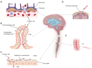 Besides the aforementioned routes, cancer cells can also exploit existing tissue planes to travel along cranial nerves and enter the CSF via the perineural space. Cancer cells from bone marrow can also use bridging veins to access the leptomeningeal space (11).