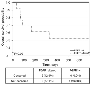 Patients with high FGFR1 expression and/or FGFR1 amplification showed a trend toward poorer OS compared to those without these alterations (P=0.09; Figure 5). No survival relationships were identified for FGFR2–4 alterations.