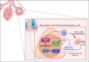 Notably, the key molecular and immunohistochemical features in our cohort were enriched among strong double expressors. Combined with previous studies suggesting that NSCLCs co-expressing TTF-1 and p40 may arise from basal reserve cells of the terminal respiratory unit (22,40), our findings support a model in which TP53 mutations in such progenitor cells enable aberrant expression of both p63 and TTF-1. This hypothetical mechanism is illustrated in Figure 6.