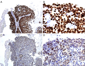 - Savari O, Febres-Aldana C, Chang JC, et al. Non-small cell lung carcinomas with diffuse coexpression of TTF1 and p40: clinicopathological and genomic features of 14 rare biphenotypic tumours. Histopathology 2023;82:242-53. [Crossref] [PubMed]