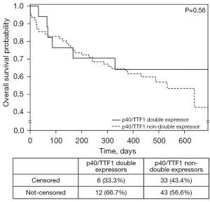 A significantly higher prevalence of solid growth patterns was observed in the double-expressing group, particularly among ADCs, representing a distinctive histopathological feature of this subset (Table 2). No significant differences were identified for other clinicopathological parameters. OS did not differ significantly between double expressors and non-double expressors [hazard ratio (HR): 0.77; 95% confidence interval (CI): 0.32–1.84; P=0.56, log-rank test; Figure 2]. Subgroup analyses stratified by histological subtype similarly showed no OS difference: for ADC cases, HR 1.18 (95% CI: 0.43–3.24; P=0.75), and for SCC cases, HR 0.27 (95% CI: 0.04–2.07; P=0.18), with non-double expressors serving as the reference group.