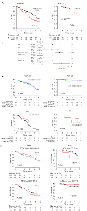 Patients with the solid subtype showed a significantly worse prognosis in the TCGA and ACC cohorts (P=0.02 and P=0.01, respectively) (Figure 2A). To clarify why patients with solid subtype adenocarcinomas display poor prognosis despite their immunologically hot tumors, we surveyed the prognostic factors of solid subtype adenocarcinomas using GOBP gene sets in the TCGA cohort (available online: https://cdn.amegroups.cn/static/public/tlcr-2025-372-2.xlsx). We found that among these gene sets, “GO_POSITIVE_REGULATION_OF_RESPONSE_TO_INTERFERON_GAMMA” [Gene Ontology Biological Process-Interferon-Gamma (GOBP-IFNG)] showed a lower hazard ratio with a low P value among solid subtype adenocarcinomas in TCGA. In the multivariate analysis, the GOBP-IFNG low group was a poor prognostic factor, together with a high pathological stage and solid subtype (Figure 2B). In Kaplan-Meier analysis, patients in the GOBP-IFNG low group had a poorer prognosis than those in the GOBP-IFNG high group among the solid subtype in the TCGA cohort (P=0.02), and the tendency of survival inferiority of the GOBP-IFNG low group was similar in the ACC cohort (P=0.18) (Figure 2C). Conversely, IFN-γ expression did not affect the prognosis of the solid subtype (Figure 2D) and cytolytic activity (CYT) score, calculated using granzymes A (GZMA) and perforin (PRF1) mRNA expression levels (27), did not affect the prognosis in the solid subtype (Figure S2). These findings suggest that the IFN-γ response pathway, rather than the amount of IFN-γ and cytotoxic substances in the tumor, may be important for OS in solid subtype adenocarcinoma. In addition, among GOBP-IFNG high group, the OS in solid subtype was significantly worse than that in non-solid subtype (P=0.001). In contrast, among the GOBP-IFNG low group, there is no difference for OS between solid and non-solid subtype (P=0.43). This indicates that the IFN-γ response pathway expression is a strong prognostic factor compared to histological subtype.
