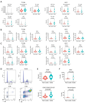 To compare the tumor immune microenvironment between the non-solid and solid subtypes, different immune cell types were quantified using XCell (20). The scores for CD8+ Tem, M1 macrophages, Th1 cells, Th2 cells, and pDC were significantly higher in the solid subtype than in the non-solid subtype in both cohorts (Figure 1A, Tables S1,S2). In addition, effector molecule genes, such as IFNG, GZMB, and PRF1, were highly expressed in the solid subtype (Figure 1B, available online: https://cdn.amegroups.cn/static/public/tlcr-2025-372-1.xlsx). Immune checkpoint molecule genes, such as PDCD1, CTLA4, TIGIT, and LAG3, were highly expressed in the solid subtype in both cohorts (Figure 1C and Tables S3,S4). Immune cell infiltration was investigated using flow cytometry on FTDs from patients in the ACC cohort. The ratio of CD8+ T cells to CD39+CD103+CD8+ T cells, which recognize a specific tumor antigen (26) was frequently observed in the solid subtype (Figure 1D,1E and Table S5). We observed a higher number of single nucleotide variants (SNVs) and neoantigens in the solid subtype (Figure 1F), suggesting that putative tumor antigen-specific T cells might be more infiltrated into the tumors of the solid subtype. These results demonstrate that the tumor immune microenvironment of solid subtype adenocarcinoma may be more immunologically active than that of the non-solid subtype.