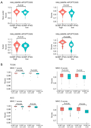 The IFN-γ response pathway expression in tumors appeared to determine the prognosis of the solid subtype. We investigated the tumor immune microenvironment and cell proliferation between the IFN-γ response pathway expression high and low groups using RNA-seq data. IFN-γ releases by immune cells may directly affect tumor cells through the induction of cell cycle arrest or apoptosis. They may invigorate MHC class I and II expression in tumor cells, leading to efficient antigen presentation in the tumor microenvironment. Therefore, we compared the status of apoptosis and MHC expression between tumors with high and low GOBP-IFNG levels. The apoptosis score (HALLMARK_APOPTOSIS) was lower in the GOBP-IFNG group than in the GOBP high group among the solid subtypes, but it was not observed among the non-solid subtypes in either cohort (Figure 3A). Similarly, MHC class II expression was lower than that of MHC class I in the low GOBP-IFNG solid subtype (Figure 3B). Therefore, poor IFN-γ responsiveness may result in lower apoptosis and weaker MHC class II expression in solid subtype adenocarcinomas.