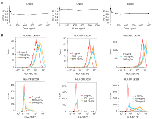 We tested IFN-γ responsiveness in our cell lines derived from solid subtype adenocarcinomas, LK028, LK226, and LK238. In the WST-8 cell proliferation assay, the proliferation of LK226 tumor cells was poorly inhibited by IFN-γ compared to that of other cell lines, LK028 and LK238 (Figure 4A). HLA-DR expression, which is equivalent to MHC class II, was not induced in LK226 cells after exposure to high concentrations of IFN-γ, despite the increased expression of HLA-ABC, which is equivalent to MHC class I was increased (Figure 4B). Thus, LK226 showed the proliferation was less inhibited by IFN-γ and HLA-DR expression was not increased, consequently that means LK226 has poor IFN-γ responsiveness linked to MHC class II but MHC class I.