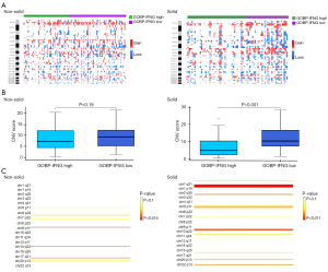 We investigated DNA damage, including CNAs. For the solid subtype, CNA was observed more frequently in the GOBP-IFNG low group than in the GOBP-IFNG high group (P<0.001) (Figure 5A,5B). However, for the non-solid subtype, no significant difference in CNA was observed between the two GOBP-IFNG groups (P=0.19). A higher frequency of CNA in each chromosome was observed in the GOBP-IFNG low group in the solid subtype, but not in the non-solid subtype (Figure 5C). This suggests that increased CNA is related to low IFN-γ response pathway expression in GOBP-IFNG low among the solid subtype.
