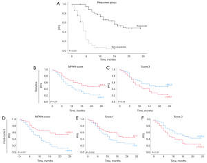 The analysis of PFS was conducted using the Kaplan-Meier method. Patients who exhibited a response to ICI therapy demonstrated a statistically significant increase in PFS when compared to non-responders (P<0.001, Figure 4A). At baseline, patients with a decreased MPHH score of 400.3 or less (P=0.01, Figure 4B), and an increased Score 3 above 384.0 (P=0.05, Figure 4C) demonstrated better survival rates. Furthermore, the post-treatment evaluations indicated that the hematological changes following three cycles of ICI therapy were also indicative of PFS. A reduced MPHH score (≤305.9, P<0.001, Figure 4D) and a decreased Score 1 of 5.4 or less (P=0.049, Figure 4E) were indicative of longer survival. Conversely, elevated values of Score 2 (>1,075.2, P=0.02, Figure 4F) were associated with enhanced PFS. These findings reiterate the significance of baseline and dynamic blood count parameters in patients undergoing ICI therapy.