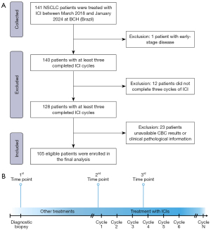CBC results from medical records were collected from 141 patients with advanced NSCLC who received ICI treatment [anti-programmed death-1 (PD-1) or anti-PD-L1], either as monotherapy or in combination, at Barretos Cancer Hospital between March 2018 and January 2024. Eligible patients were ≥18 years old, had a confirmed pathological diagnosis of NSCLC, and had available staging information indicating advanced disease (stage III or IV). Patients were excluded based on the following criteria: (I) inability to complete at least three cycles of ICI; (II) early-stage disease (stage I or II); (III) lack of available CBC results or clinicopathological data-except for PD-L1 analyses, where unavailable data were recorded as “unavailable”; and (IV) absence of imaging evaluation for treatment response assessment. All patients who met the predefined inclusion and exclusion criteria were enrolled in the study. The median follow-up period was 22 months [interquartile range (IQR): 15–36 months]. A schematic diagram of the study population is presented in Figure 1A.
