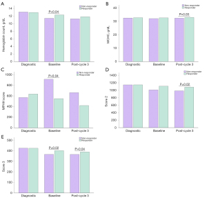 The CBC values and the developed scores were evaluated for their capacity to predict treatment response to ICIs at three distinct time points: at diagnosis, baseline, and PC3. The findings revealed that responder patients exhibited elevated baseline hemoglobin levels (P=0.04, Figure 2A), and along with elevated MCHC at PC3 (P=0.03, Figure 2B). The predictive capacity of the scores developed was also evaluated. Patients who did not respond exhibited higher MPHH values (P=0.04, Figure 2C). In contrast, patients who exhibited an unfavorable response to treatment demonstrated lower Score 2 and 3 values at PC3 (P=0.02, P=0.04, respectively; Figure 2D,2E), as well as for baseline counts for Scores 3 (P=0.02, Figure 2E). The complete dataset, including descriptive statistics for all primary characteristics and CBC-derived scores, is provided in Table S1 and Figure S1. Receiver operating characteristic (ROC) curve analyses were also performed for each parameter; however, none demonstrated acceptable discriminatory performance, as all area under the curve (AUC) values were below 0.7 (data not shown).