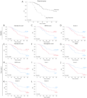 OS was estimated using the Kaplan-Meier method, with a median follow-up period of 22 months (IQR: 15–36 months). At 30 months, OS rates were 26.7% for non-responders and 65.6% among responders. Patients who responded to ICI treatment had significantly longer OS compared to non-responders (P<0.001, Figure 3A), highlighting the critical impact of treatment response on long-term outcomes. At baseline, specific blood count parameters were significantly associated with improved OS. Specifically, patients with hematocrit levels above 37.3% (P=0.004, Figure 3B), MPHH score ≤400.3 (P=0.007, Figure 3C), and Score 3 >384.0 (P=0.02, Figure 3D) demonstrated better survival outcomes.